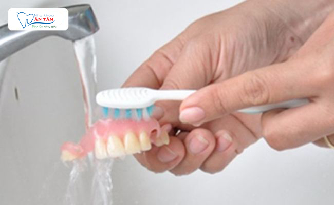 • Sử dụng bàn chải lông mềm và kem đánh răng: chải nhẹ nhàng cả hai mặt của răng giả để loại bỏ thức ăn bám dính.