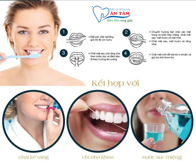 • Dùng bàn chải lông mềm, chải nhẹ nhàng theo góc 45 độ nghiêng về nướu.